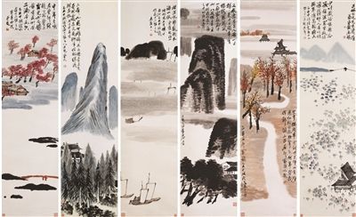 《山水十二条屏》为齐白石1925年所绘,每一条屏画面尺寸纵180厘米,横47厘米,共计十二条,分别为《江上人家》《石岩双影》《板桥孤帆》《柏树森森》《远岸余霞》《松树白屋》《杏花草堂》《杉树楼台》《烟深帆影》《山中春雨》《红树白泉》《板塘荷香》。该作诗、书、画、印兼备,形制装裱统一,为齐白石极具代表性的山水作品。此《山水十二条屏》当年为齐白石绘赠民国名医陈子林的祝寿之作,后由白石弟子郭秀仪与其夫黄琪翔珍藏。据考,此作1954年在“齐白石绘画展览会”首次露面。随后,1958年1月“齐白石遗作展”中将此十二条屏悉数展出,之后历经多次重要展览及著录。郎绍君曾言:这十二条屏把远游印象、写生画稿、前人模式和居京后的创作经验熔于一炉,构图简洁、境界新奇,集勾勒和泼墨为一体,实属难得。